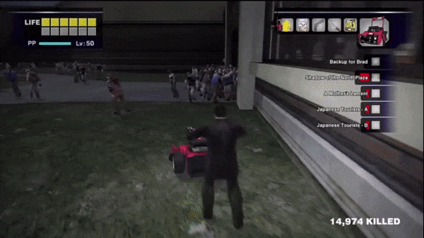 Here’s the kicker. Every single mission in Dead Rising comes with a timer. Frank has 72 hours before rescue arrives to get him out of Willamette, which translates to about 6 hours in-game with a playable epilogue on top. In the main storyline, running out of time means game over. Side quests, however, are ephemeral. They appear at specific moments and if you don’t complete them on time, they are gone, along with the survivors you could have saved or cool weapons you could have picked up from psychopaths.